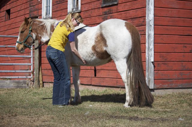 This is Dakota, 18 years young! He is used extensively in the summer for trail riding and has all winter off. Using some key points, I am checking for areas that will need attention before he is put back to work for the season. Considering his age, he is in great shape and is not under or overweight (okay, maybe a few extra pounds!).