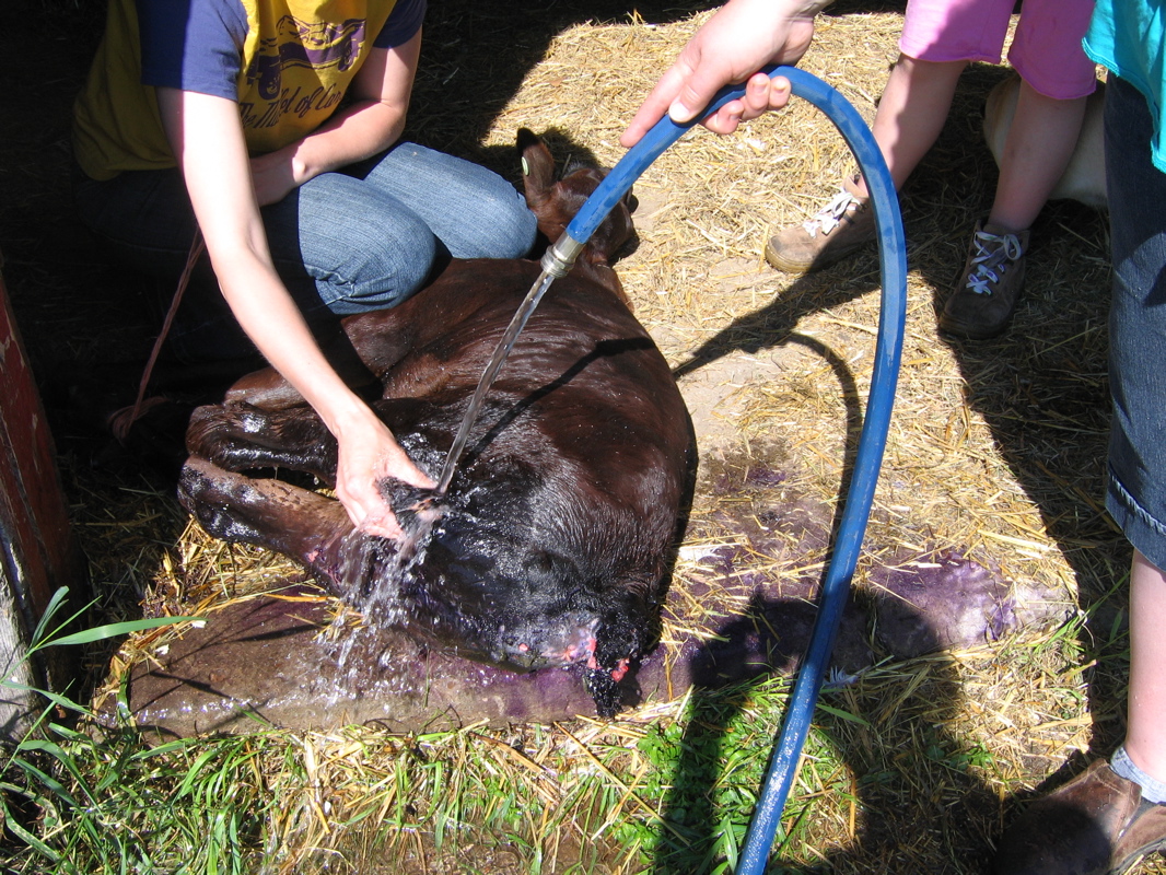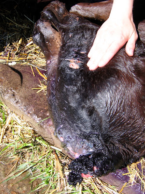This is a month and a half old heifer calf born to a first time calver (Black Angus X) that has been attacked by something in one of our pastures. This poor little beast has had it's tail bitten off at the base and suffered lacerations/puncture wounds to the flanks and neck area. Since no one was witness to this attack, we're not really certain of what it was that did so much damage.