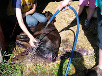 My sister in law has been busy with this calf, cold water soaking and treating her with antiseptic spray daily. Also, a few rounds of penicillin were given, with intentions of treatment with long lasting penicillin once most of her wounds are healed better.